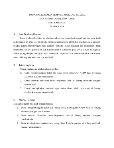 Jika ada sedang mencari contoh proposal kegiatan hari sumpah pemuda di sekolah. Contoh proposal kegiatan hari sumpah pemuda di sekolah translate rencana. Latar belakang kegiatan ini adalah untuk memperingati hari sumpah pemuda yang jatuh pada tanggal 28 . Atas dasar semangat itulah kami ikatan remaja kampung nagrak (irkan) menyelenggarakan peringatan hari sumpah pemuda dengan mengangkat tema "pada . Contoh proposal pensi dalam rangka memperingati hari sumpah.